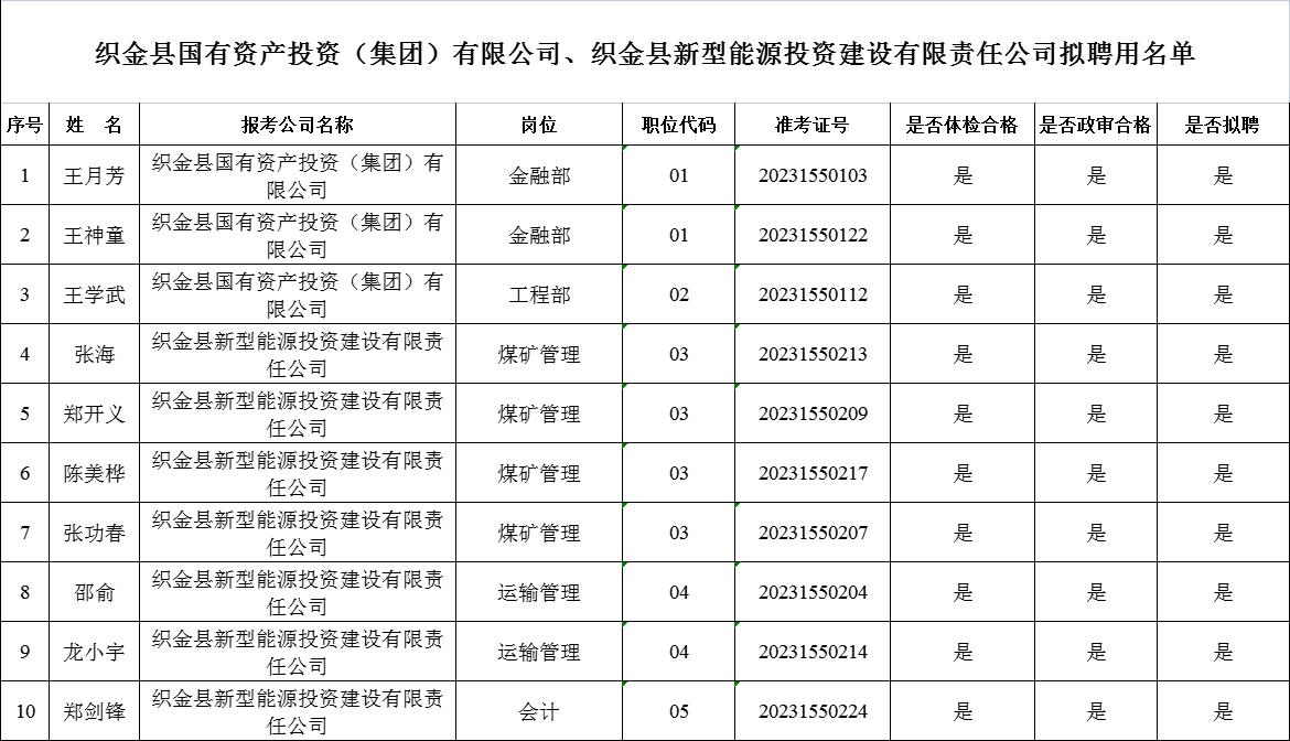 根據(jù)《織金縣國有資產(chǎn)投資(集團)有限公司、織金縣新型能源投資建設(shè)有限責(zé)任公司2023年面向社會公開招聘工作人員公告》,經(jīng)過報名、筆試、面試、資格審查、體檢、政審等程序,現(xiàn)對擬聘用人(名單見附件1)予以公示。acQ貴州163_163貴州事業(yè)單位考試信息網(wǎng)_163貴州人事考試信息網(wǎng)_貴州163網(wǎng)